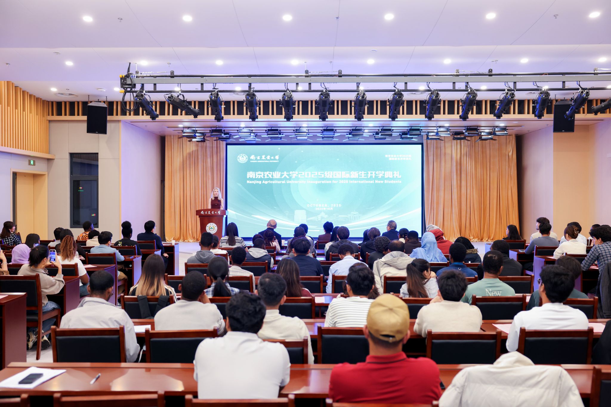 10月14日,南京农业大学2025级国际新生开学典礼在滨江校区会议中心举行。来自俄罗斯、厄瓜多尔、泰国、肯尼亚等34个国家的100余名国际新生齐聚一堂,开启他们在南农的求学之旅。南京农业大学副校长朱艳,国际合作与交流处处长、国际教育学院院长石松,食品科技学院副院长李远等出席典礼。典礼由国际合作与交流处副处长、国际教育学院副院长吴磊主持。
