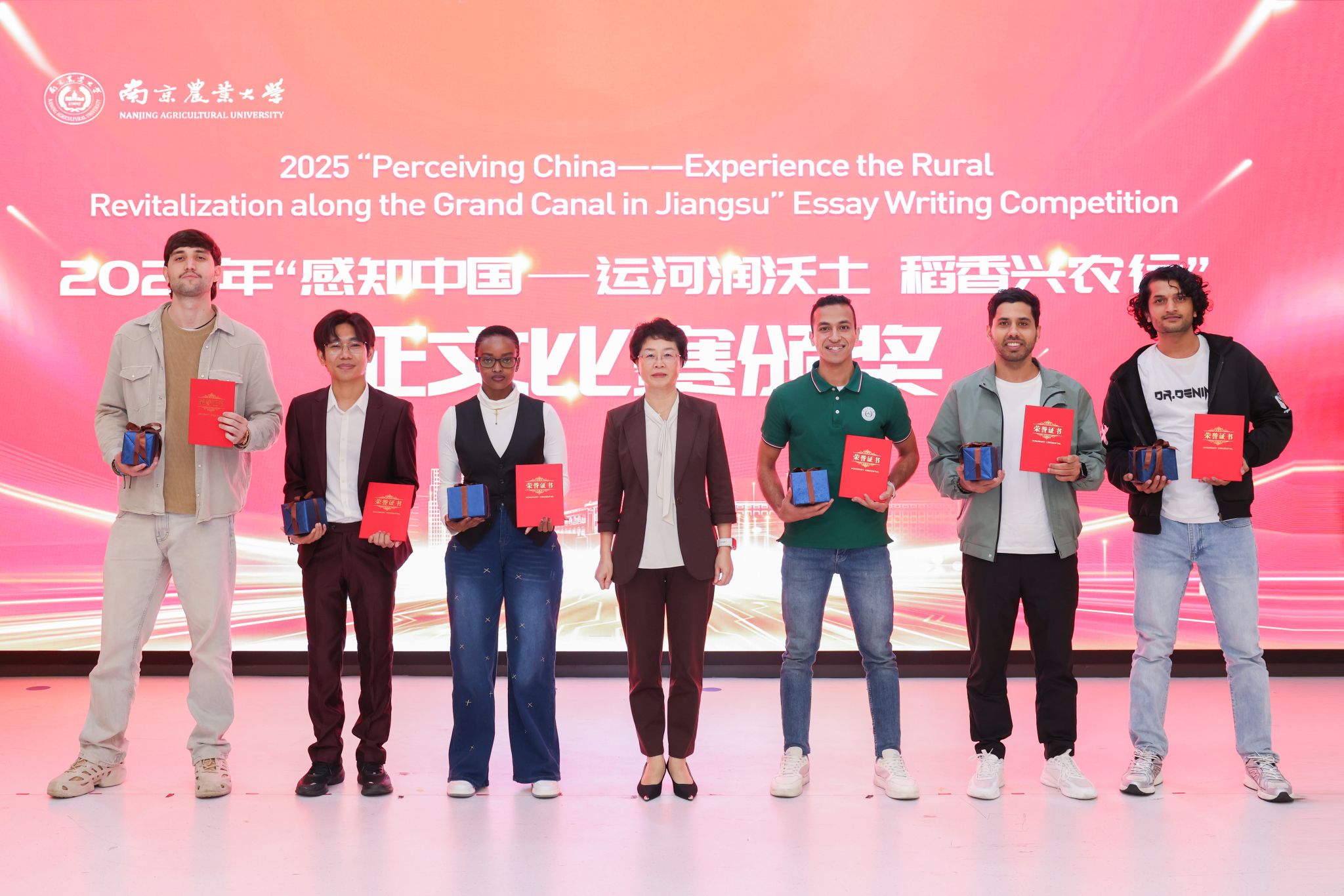 典礼上,朱艳为2025年“感知中国——运河润沃土 稻香兴农行”国际学生征文比赛的获奖者颁发了证书。该活动以“行走的课堂”为载体,通过运河文化、古城保护、非遗体验三大维度,帮助留学生深入感知中国文化的深厚底蕴与现代创新。