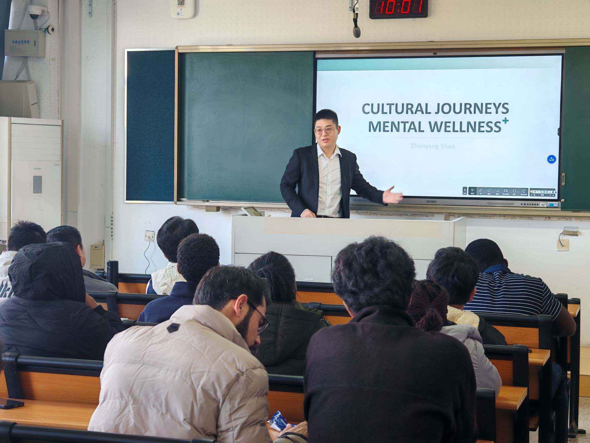 随后,心理辅导员邵振洋老师带来了心理健康教育专题讲座。他深入剖析了留学生在跨文化适应中可能面临的孤独感与学业压力,并提供了行之有效的自我调节方法,同时详细介绍了学校的心理咨询服务渠道,鼓励同学们主动寻求支持,积极构建自己的“朋友圈”。