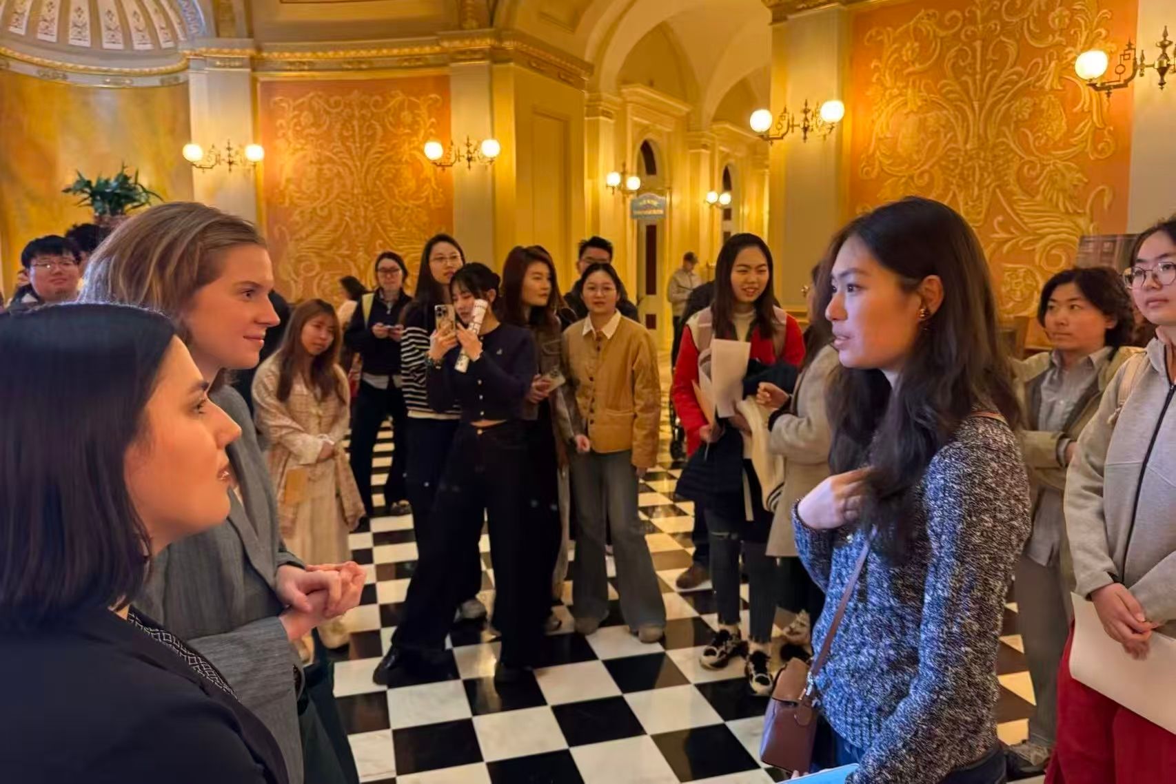此次交流项目恰逢江苏省与美国加州建立友好省州关系15周年,交流团专程参访了加州州政府议事大厦,与州政府工作人员开展友好会谈。刘素惠代表交流团回顾了2011年江苏与加州建立友好省州关系的重要意义,重温了2023年加州州长纽森访问江苏期间,在盐城湿地珍禽国家级自然保护区与丹顶鹤“加利福尼亚”亲切互动的温馨场景,向美方工作人员传达了来自江苏的诚挚问候,并向加州州政府工作人员赠送了南京农业大学文化纪念品及寓意吉祥的“福”字,传递了南农人对江苏与加州、中国与美国友好关系永续发展的美好祝愿。州政府工作人员Madeline Roorda等对交流团的到来表示欢迎,她表示,与交流团师生的交流让他们深切感受到中国文化的魅力与中美民间友好的温度。